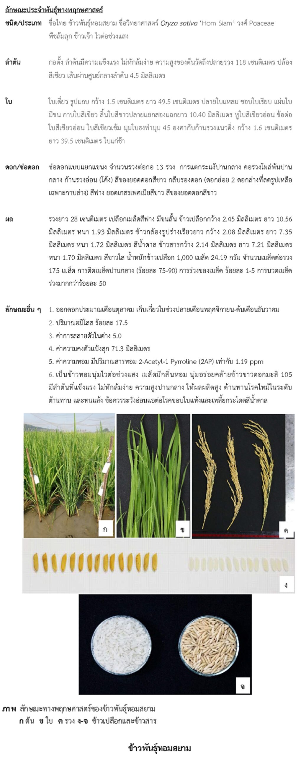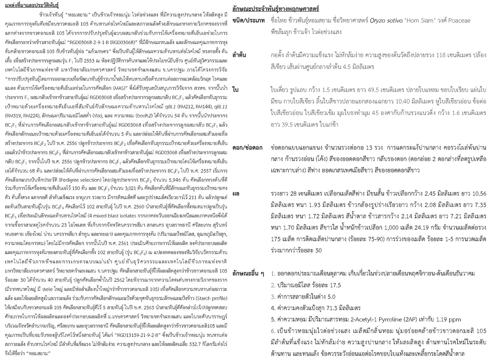 เป็นข้าวเจ้านาปีพันธุ์ใหม่ ข้าวหอมสยาม ต้นเตี้ย ลำต้นแข็งแรง ไม่หักล้มง่าย ต้านทานโรคใบไหม้ และให้ผลผลิตสูง เก็บเกี่ยวง่าย คุณภาพการหุงต้มดีเหมือนข้าวขาวดอกมะลิ 105